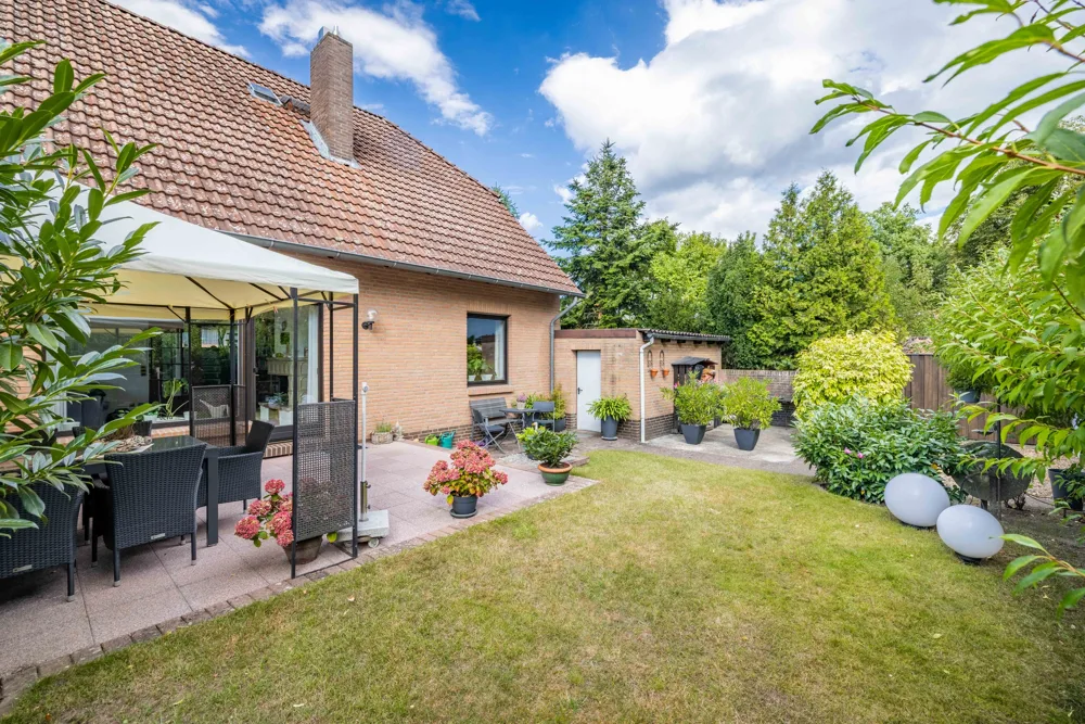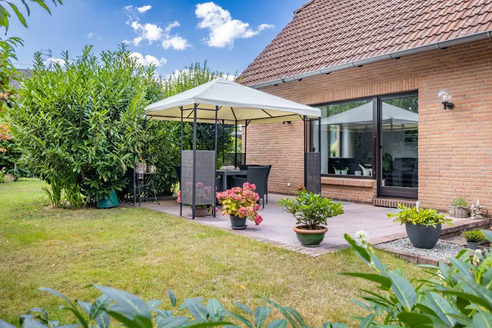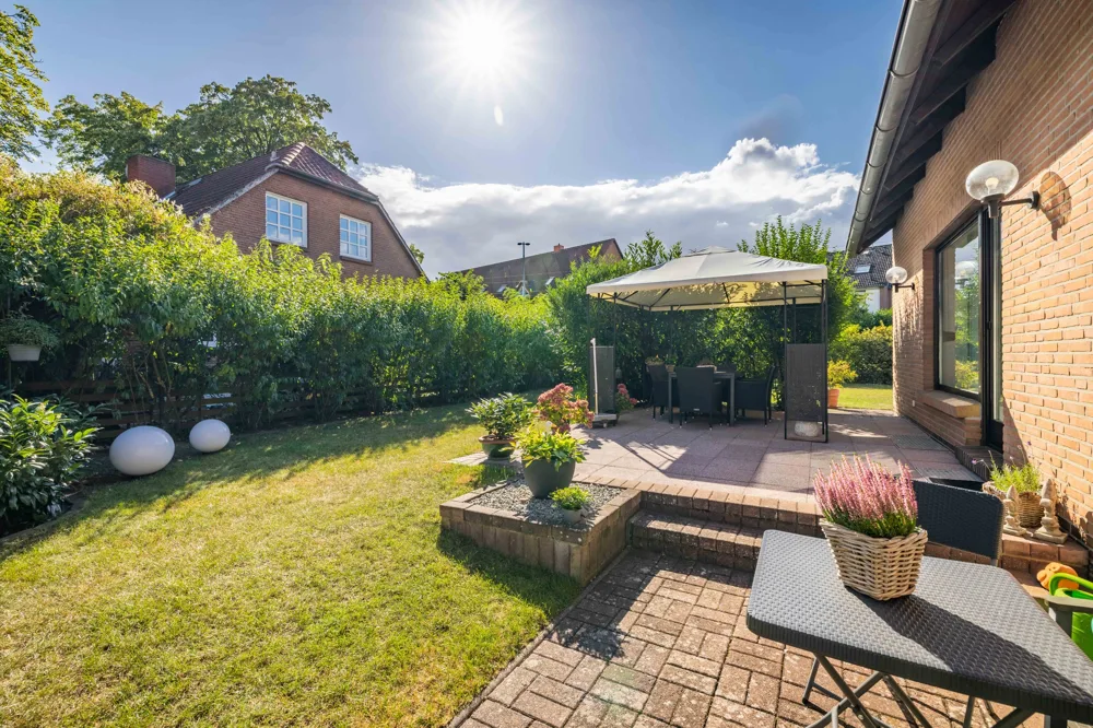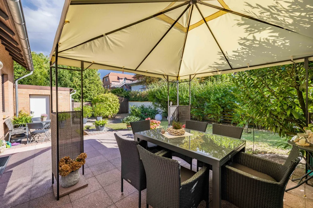 Auch außen zeigt sich das Haus von seiner besten Seite: Die Garage mit Zugang zum Haus und Garten, eine gepflegte Grünfläche sowie eine Terrasse mit Pavillon bieten viel Raum für entspannte Familienzeit.