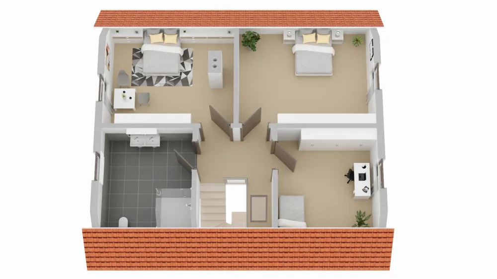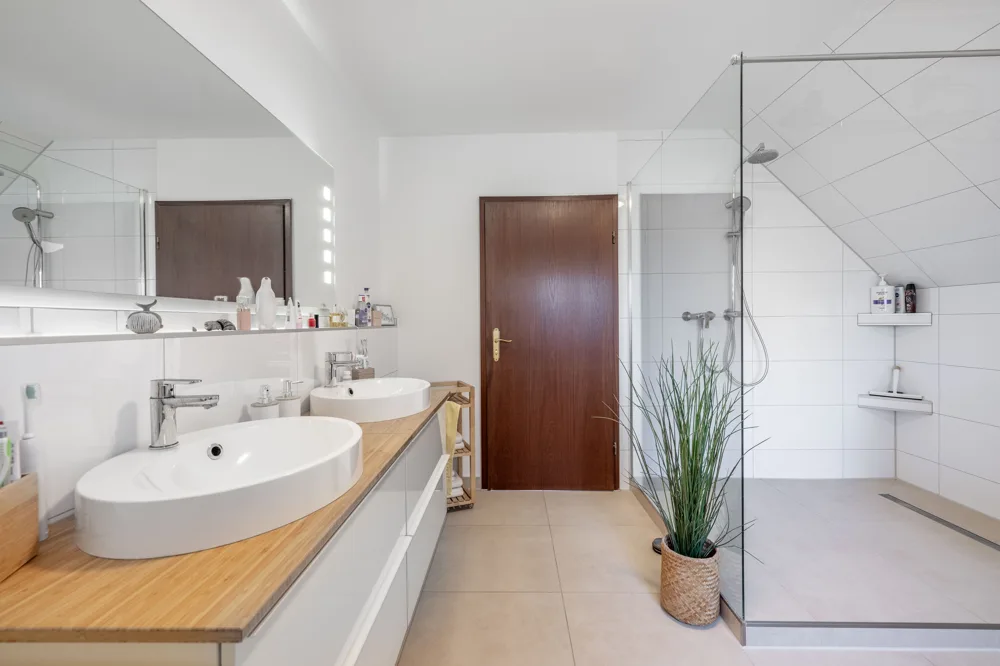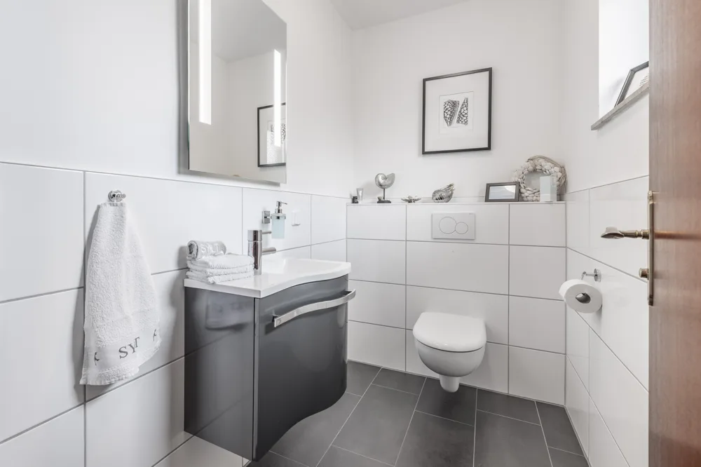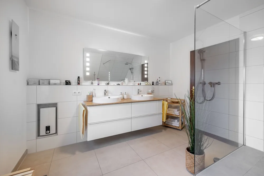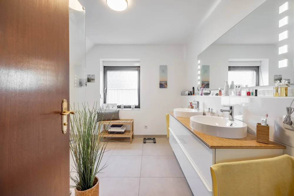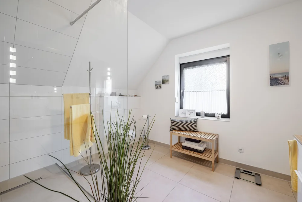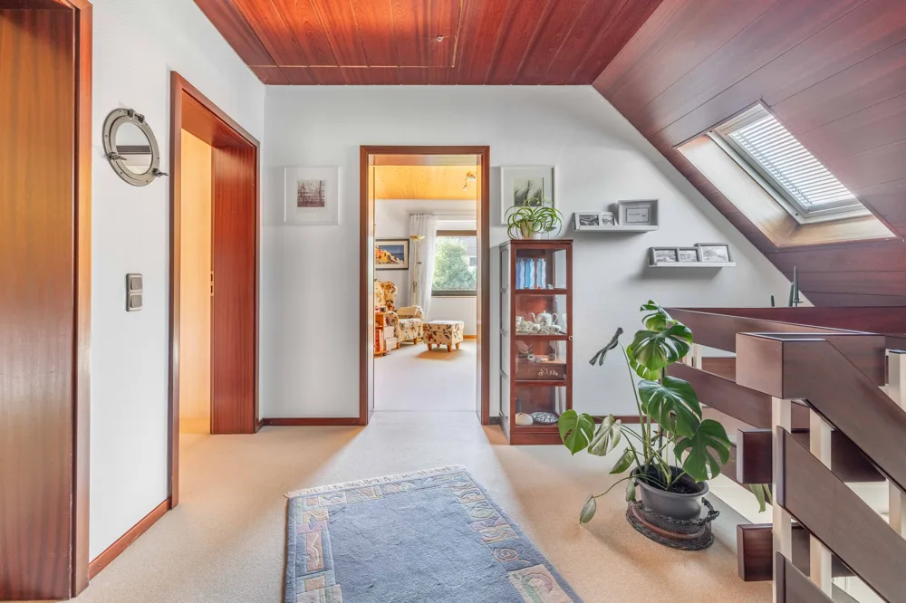 Das Obergeschoss bietet drei vielseitig nutzbare Zimmer, ideal als Elternschlafzimmer, Kinder- oder Arbeitszimmer. Das Highlight: Das bereits aufwendig modernisierte Bad mit Doppelwaschtisch und großer Wohlfühldusche, das Wellness-Atmosphäre versprüht.
