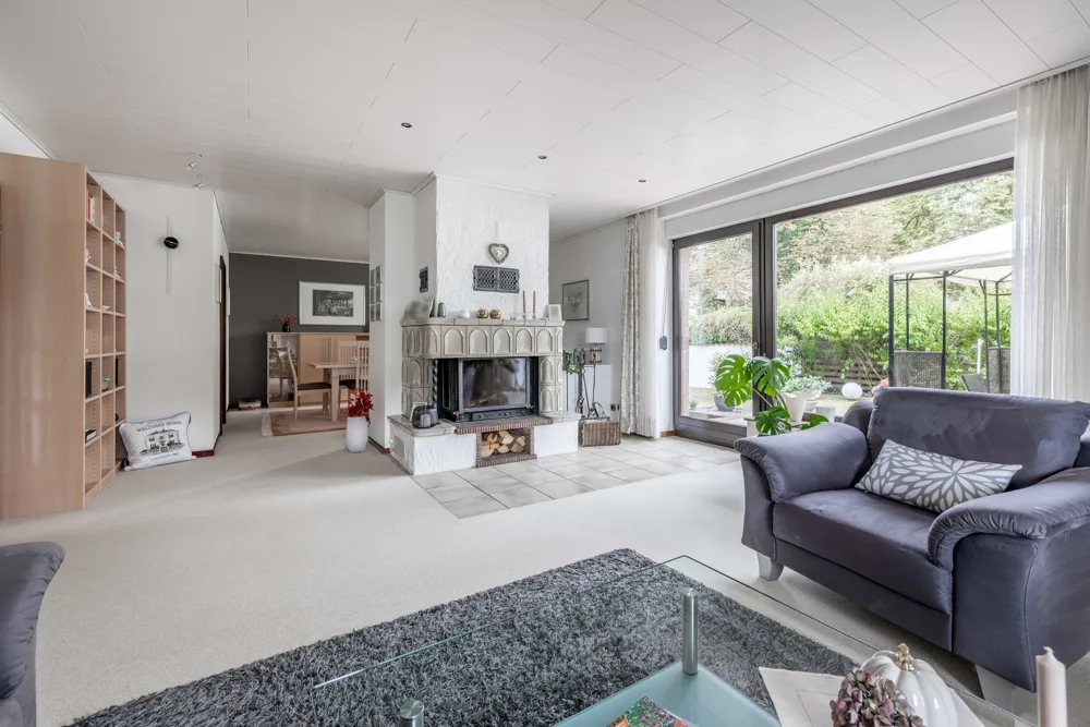 – helles Wohn-Esszimmer mit gemauertem Kamin und Zugang zur Terrasse,