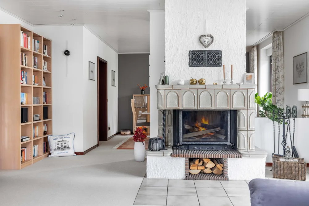 Im Erdgeschoss erwartet Sie ein lichtdurchflutetes Wohn- und Esszimmer mit gemütlichem, gemauertem Kamin und direktem Zugang zur Terrasse. Die großzügige Küche mit wertiger Einbauküche in Esche weiß lädt zum gemeinsamen Kochen und Genießen ein. Ein bereits modernisiertes Gäste-WC sowie ein hübscher Garderobenbereich runden diese Etage ab.