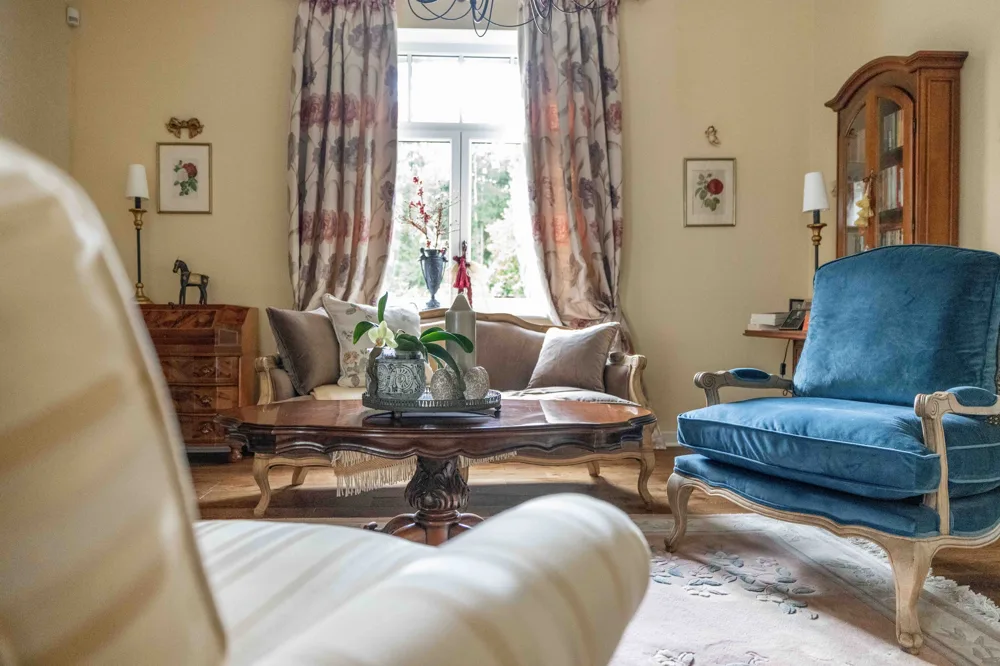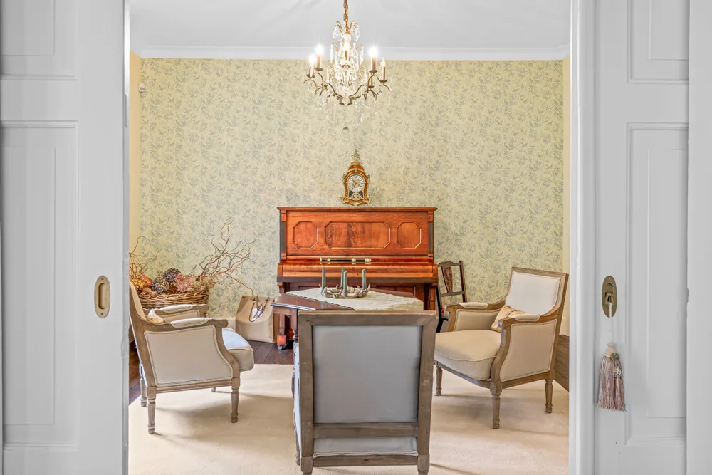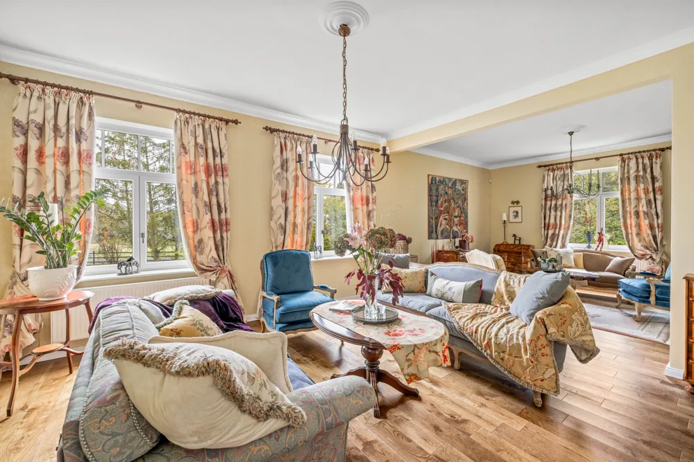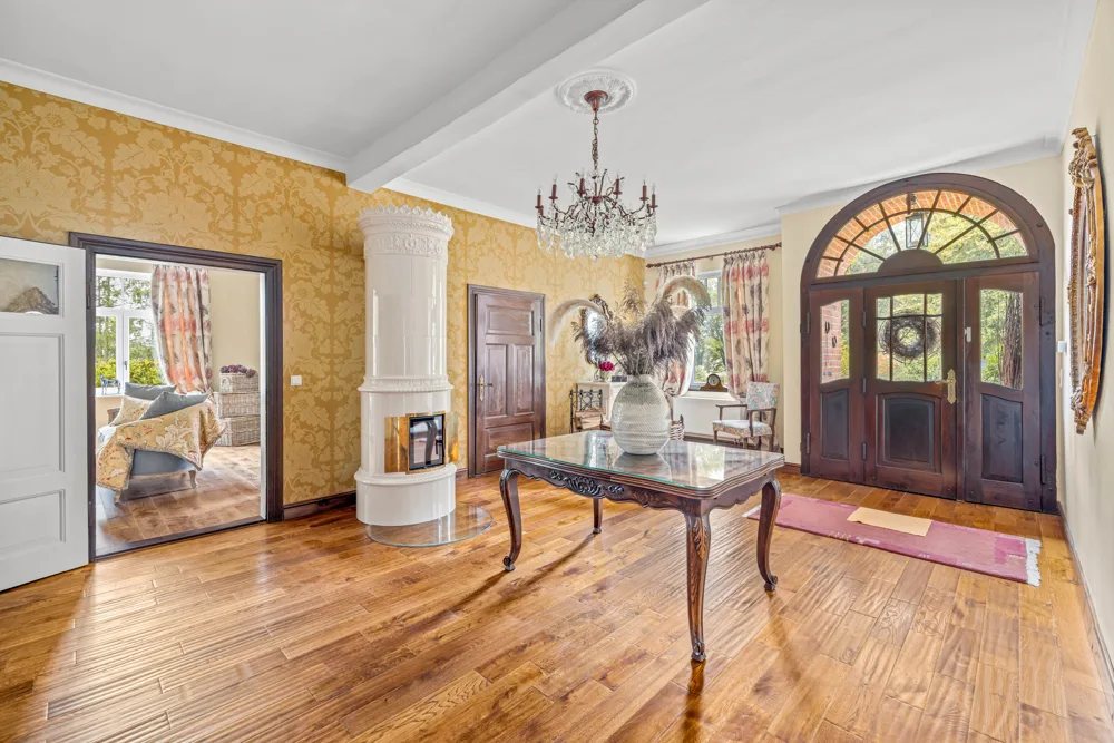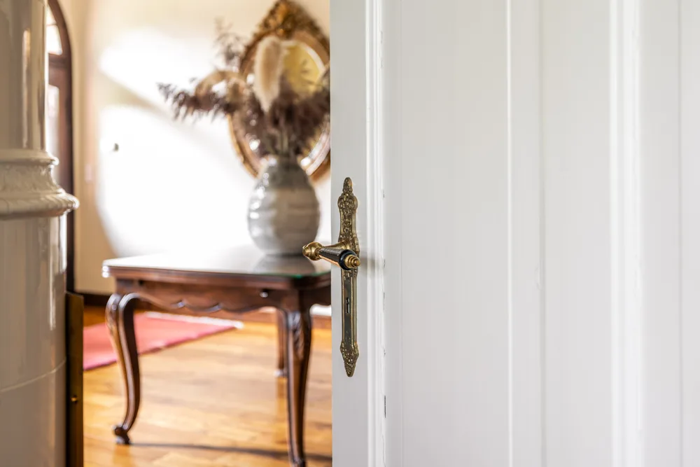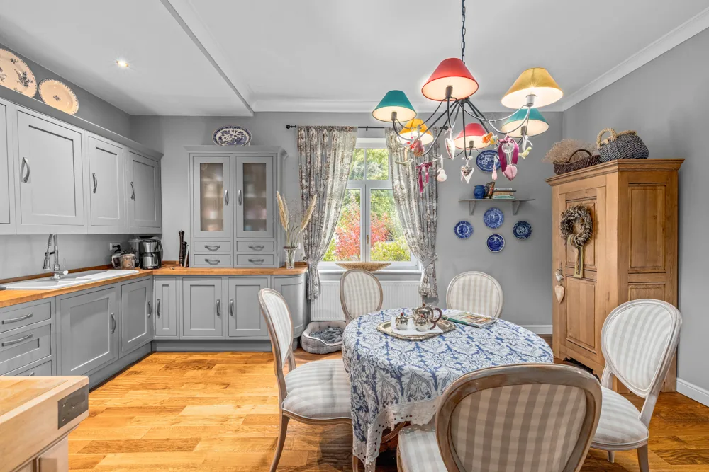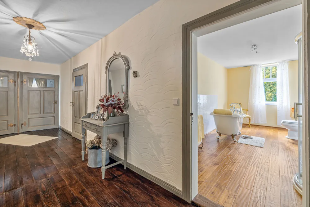 Die Eingangshalle mit Kamin, wertiger Tapetengestaltung und einem Kronleuchter heißt Sie willkommen. Echtholzdielen, detailverliebte Beschläge, historische Türen und moderne Fenster in historischer Optik schaffen ein warmes Ambiente. Im Erdgeschoss erwarten Sie ein großzügiger Salon, ein Esszimmer mit Schiebetüren, eine Landhausküche sowie ein Gästezimmer mit Ankleide. Das viktorianisch gestaltete Badezimmer mit freistehender Badewanne bildet ein Highlight, das den Charakter der gesamten Immobilie widerspiegelt. Auch der Hauswirtschaftsraum mit separatem Duschbad, Abstellkammer und Platz für Ihre Reit- oder Outdoorbekleidung wurden mit Bedacht umgesetzt.